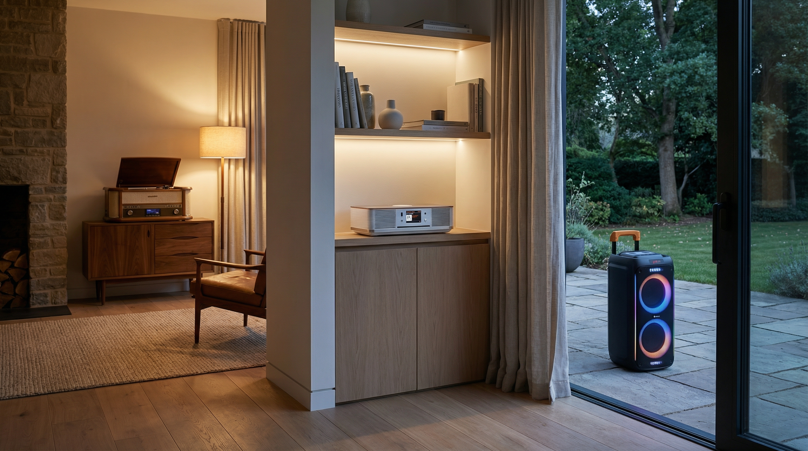 Zeitlose Retro-Radios, klassische Stereoanlagen und Plattenspieler im Design vergangener Jahrzehnte – kombiniert mit moderner Audiotechnik für den Alltag.